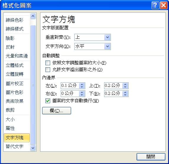 為了要在文字方塊中填入後台色采,通常您會利用在「繪圖東西-花式」索引標籤面板中的[圖案填滿]指令按鈕去處理,我習慣利用群組指令的對話方塊,於是我履行了快捷功能表中的[花樣化圖案]指令,當我切換到此中的[文字方塊]標籤畫面上時,看到最下方有一個Word才有的[欄]指令按鈕,這不是Word文件中才有的專屬格局嗎?