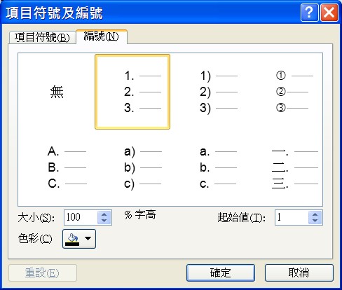 於是,起頭進行連續串的測試,結果發目前[項目符號]指令中履行[項目符號及編號]指令,它所啟動的對話方塊可以進行多種符號及編號的設定功課翻譯
